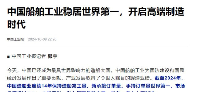 中国工业报2024年10月8日《中国船舶工业稳居世界第一,开启高端制造时代》报道
