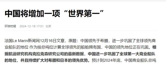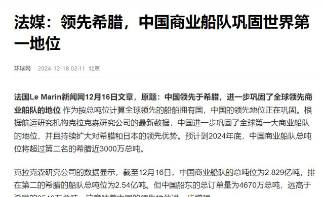 环球网2024年12月18日《法媒:领先希腊,中国商业船队巩固世界第一地位》报道